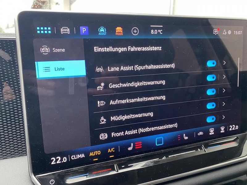 - Innen: Isofix-Aufnahmen für Kindersitz an Beifahrersitz und Rücksitze außen (inkl. i-Size-Kindersitze) Klimaanlage Air Care Climatronic 3-Zonen inkl. Fondbedienung und Aktiv-Kombi-Filter Mittelarmlehne vorn Rücksitz geteilt / klappbar, verschiebbar, Mittelarmlehne und Durchladefunktion Rücksitz geteilt / klappbar, verschiebbar, Neigungsverstellung, Durchladefunktion und Mittelarmlehne Infotainment & Kommunikation: Notrufsystem Sicherheit & Assistenz: Airbag Fahrer-/Beifahrerseite, Beifahrerairbag abschaltbar Automatische Fahrlichtschaltung mit Leaving Home / Coming-Home-Lichtfunktion, Tagfahrlicht LED Fahrassistenz-System: Ablenkungs- und Müdigkeitserkennung Fahrassistenz-System: Autom. Distanzregelung (ACC inkl. Stop&Go-Funktion) Fahrassistenz-System: Berganfahr-Assistent Fahrassistenz-System: Fahrprofilauswahl Fahrassistenz-System: Fernlichtregulierung (Light Assist) Fahrassistenz-System: Kreuzungs-Assistent Fahrassistenz-System: Notbremsassistent Front assist mit Fußgänger- und Fahrraderkennung Fahrassistenz-System: Spurhalteassistent (Lane Assist) Fahrassistenz-System: Spurwechselassistent (Side Assist) mit Auspark-Assistent und Ausstiegswarnung Fahrassistenz-System: Verkehrszeichenerkennung Geschwindigkeitsbegrenzer mit vorausschauender Geschw.-Regelung Keyless-Start mit Safesicherung Rückfahrkamera (Rear View) Scheibenwischer mit Regensensor Seitenairbag und Kopfairbag vorn und hinten, Center-Airbag vorn Sicherheitsgurte hinten außen mit Gurtstraffer Emotion Paket Zentralverriegelung Außen: Außenspiegel elektr. verstell-, heiz- und anklappbar, mit Memory Frontscheibe Verbundglas, wärmedämmend Räder & Technik: Anti-Blockier-System (ABS) Elektron. Stabilitäts-Programm (ESP) mit Bremskraftverstärker elektro-mechanisch LM-Felgen Otto-Partikelfilter (OPF) Reifenkontroll-Anzeige Servolenkung elektro-mechanisch und geschwindigkeitsabhängig Sonstiges: App-Connect Wireless (Apple CarPlay, Android Auto) Ausstattung Life Außenspiegel asphärisch, links und konvex, rechts Außenspiegel mit Umfeldleuchte und Projektionsfunktion Außenspiegel und Türgriffe außen in Wagenfarbe Bordwerkzeug Dachhimmel Stoff Ceramique (hellgrau) Digital Cockpit PRO (Instrumentenanzeige digital) Fahrassistenz-System: Abbiegebremsfunktion und Ausweichunterstützung Fahrerlebnisschalter inkl. Innenraumerlebnis Atmospheres Fußgänger-Schutzmaßnahmen erweitert Fußmatten Textil Gepäckraumboden höhenverstellbar Infotainment-System mit Touchscreen-Farbdisplay 12,9 Zoll Innenausstattung: Dekor-Set Life Innenspiegel mit Abblendautomatik Kopfstützen hinten (3-fach) Lautsprecher (8) Lendenwirbelstützen vorn, pneumatisch verstellbar Mild-Hybrid-Technologie Mittelkonsole Standard Mobile Online Dienste Vorbereitung We Connect und We Connect Plus Nebelschlussleuchte einseitig und Rückfahrleuchten beidseitig Nichtraucher-Paket Parkbremse elektrisch mit Auto-Hold-Funktion Radioempfang digital (DAB+) Reifen-Reparaturkit (Tire Mobility Set) Schadstoffarm nach Abgasnorm Euro 6e Sitzbezug / Polsterung: Stoff Life Sitze vorn höhenverstellbar Sitze: Komfortsitze vorn Sitzlehne vorn rechts umklappbar Sonnenblenden mit Spiegel (beleuchtet) Steckdose 12V im Koffer-/Laderaum Stoßfänger Life Türgriffschalen außen beleuchtet Verbandkasten, Warndreieck und Warnweste(n) Warnanlage für Sicherheitsgurte vorn und hinten