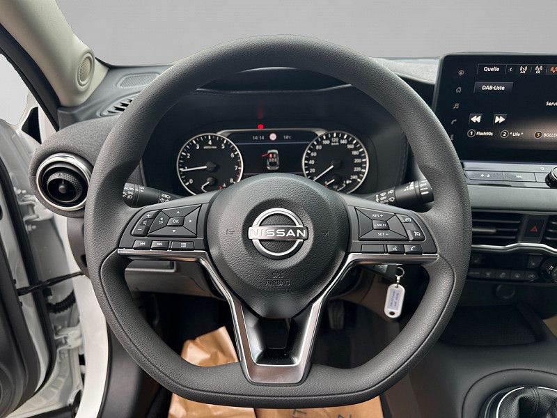 - analogem Tacho und Drehzahlmesser Mittelkonsole mit Staufach und Mittelarmlehne NissanConnect Infotainment: 12,3 Touch screen mit FM/DAB+ Tuner Bluetooth Freisprecheinrichtung und Android Auto & Apple CarPlay 4 Lautsprecher Rücksitzbank asymmetrisch (60:40) um klapp bar mit 3 höhenverstellbaren Stoffpolsterung USB-A und USB-C Anschlüsse vorne und hinten 12V Steckdose vorne Vorverkabelung für Anhängerkupplung Zentralverriegelung ABS